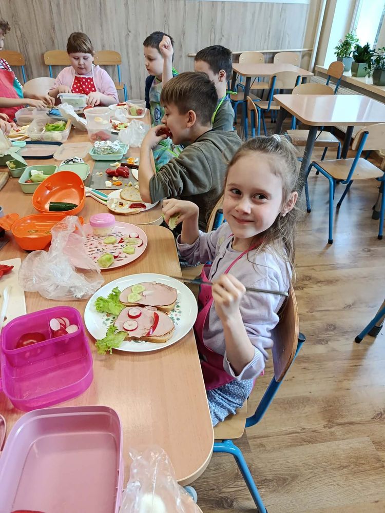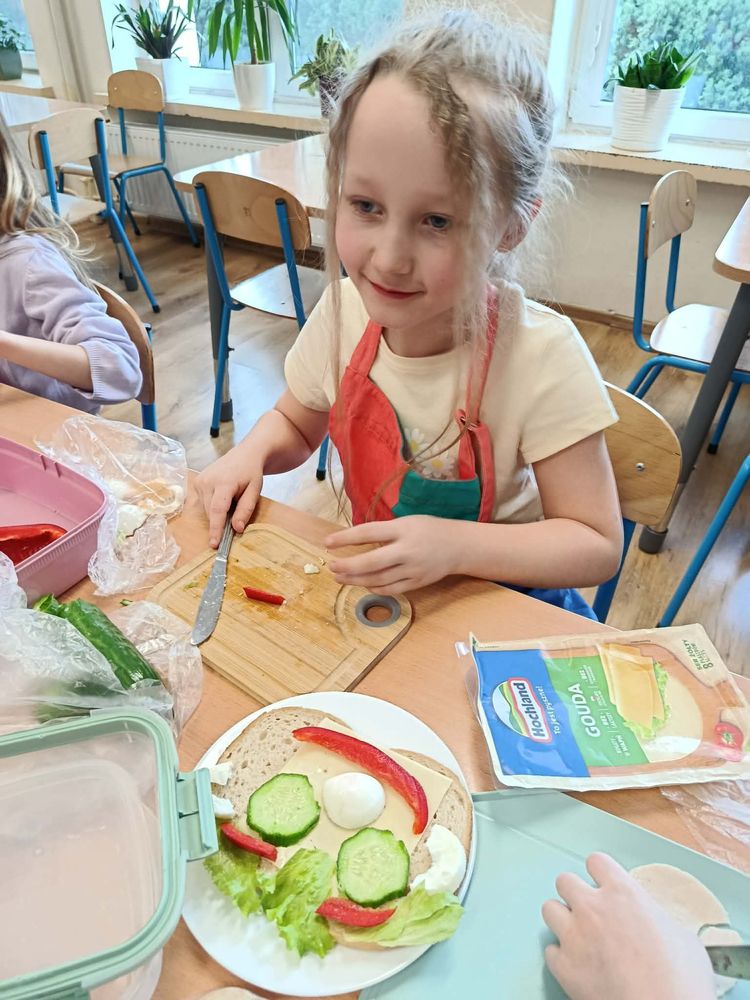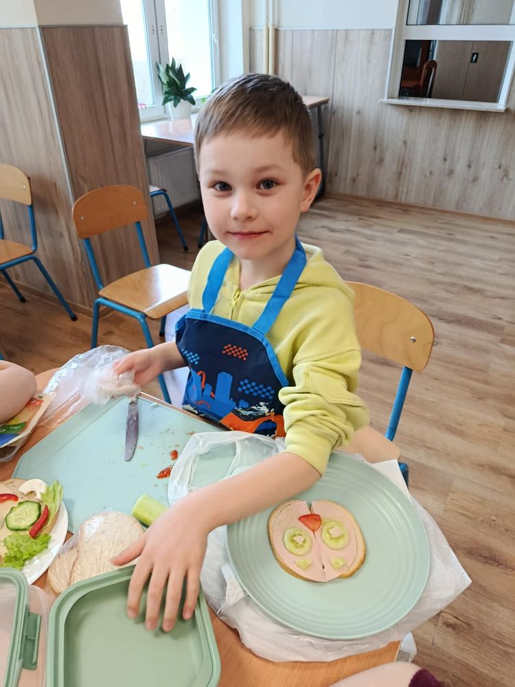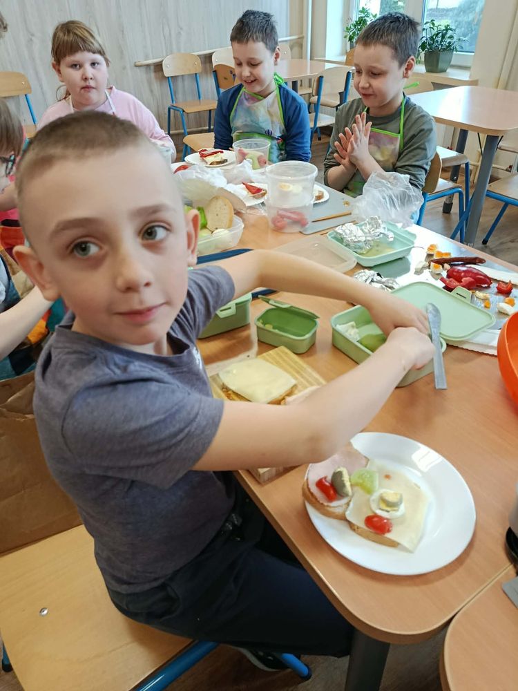 W dniu 16.03.2026r. uczniowie klasy I w ramach lekcji przygotowali dla siebie śmieszne kanapki. Przynieśli do szkoły potrzebne produkty. Na początku przypomnieli sobie zasady bezpieczeństwa, których należy przestrzegać podczas posługiwania się nożem. Dzieci samodzielnie smarowały pieczywo masłem, a następnie układały na kromkach wybrane przez siebie produkty.