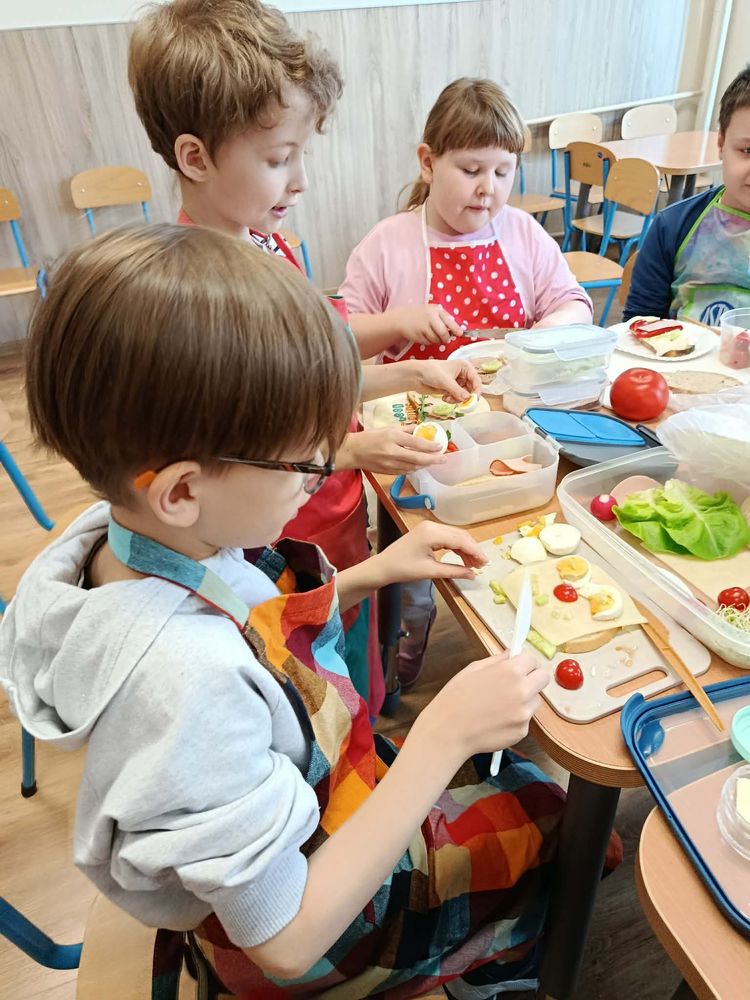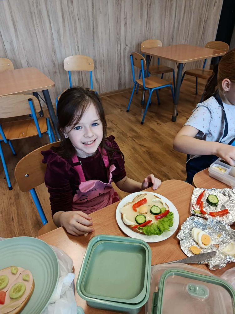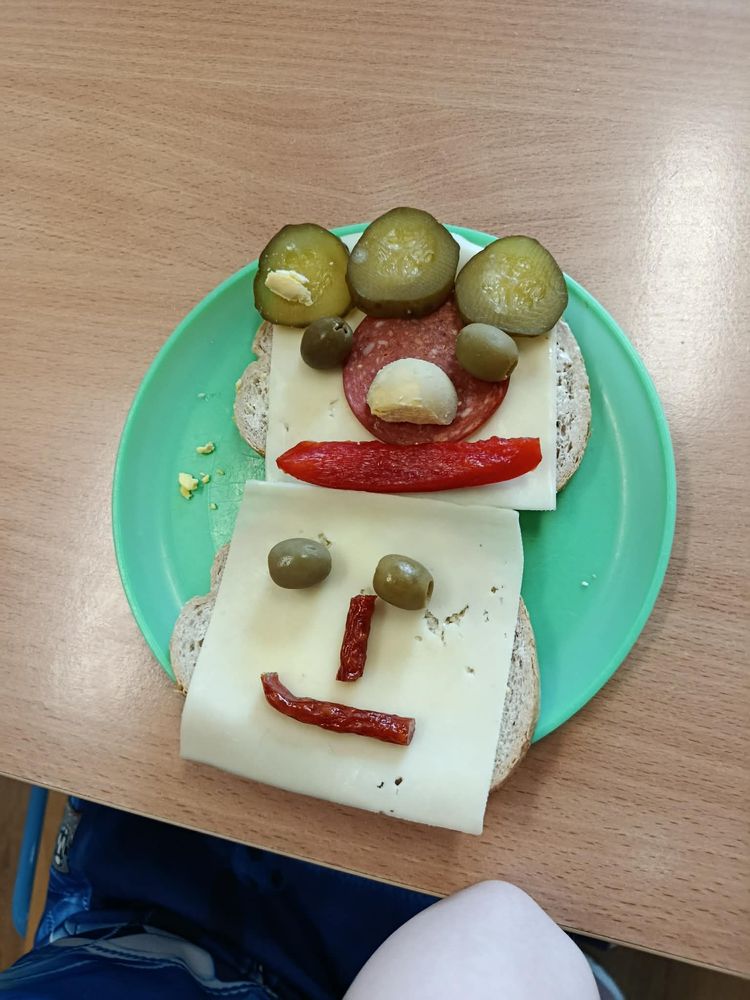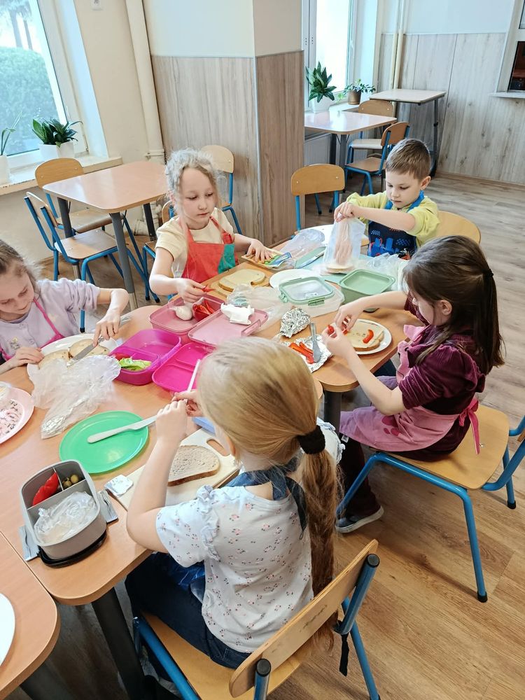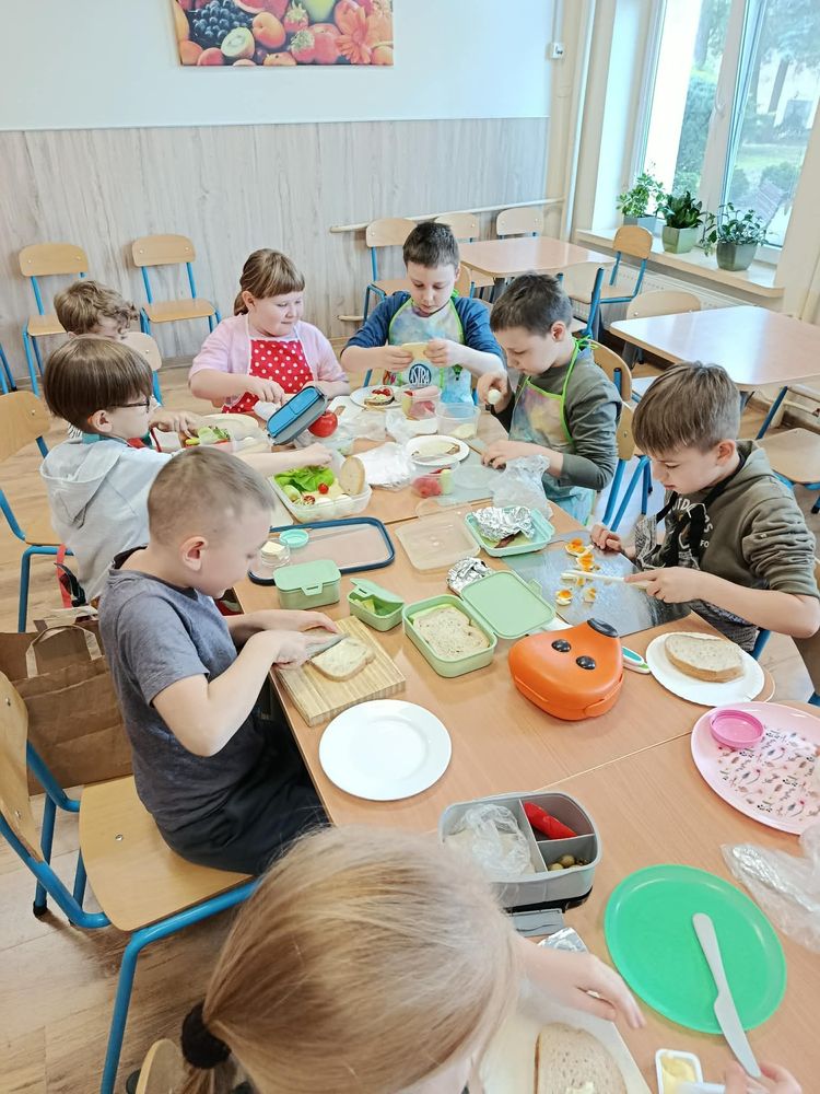 W dniu 16.03.2026r. uczniowie klasy I w ramach lekcji przygotowali dla siebie śmieszne kanapki. Przynieśli do szkoły potrzebne produkty. Na początku przypomnieli sobie zasady bezpieczeństwa, których należy przestrzegać podczas posługiwania się nożem. Dzieci samodzielnie smarowały pieczywo masłem, a następnie układały na kromkach wybrane przez siebie produkty.