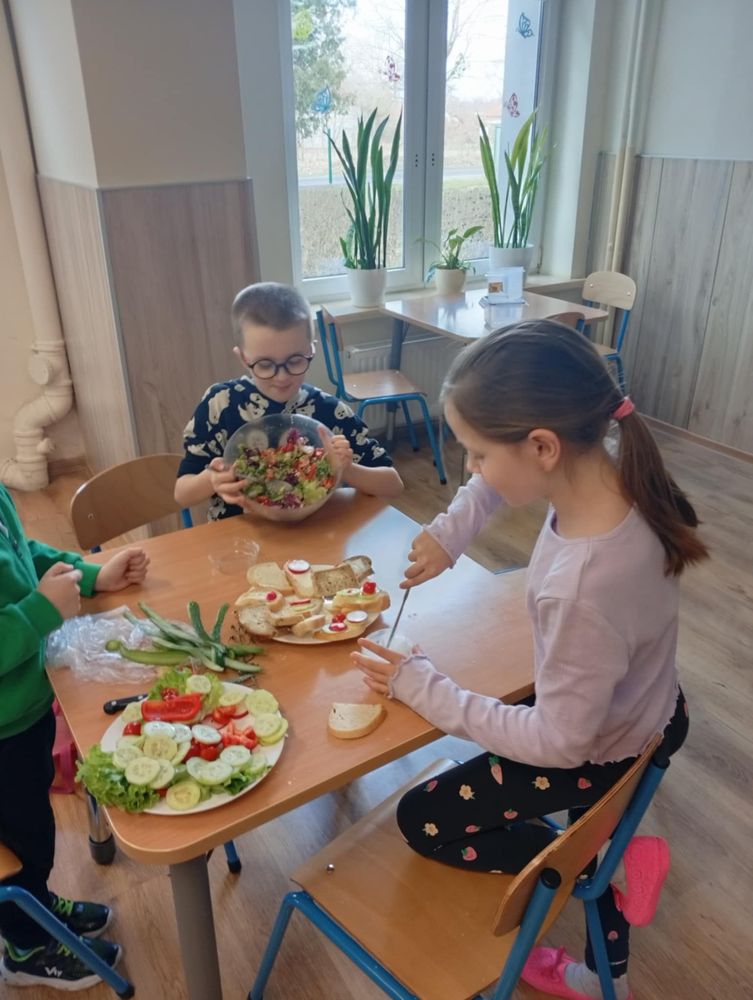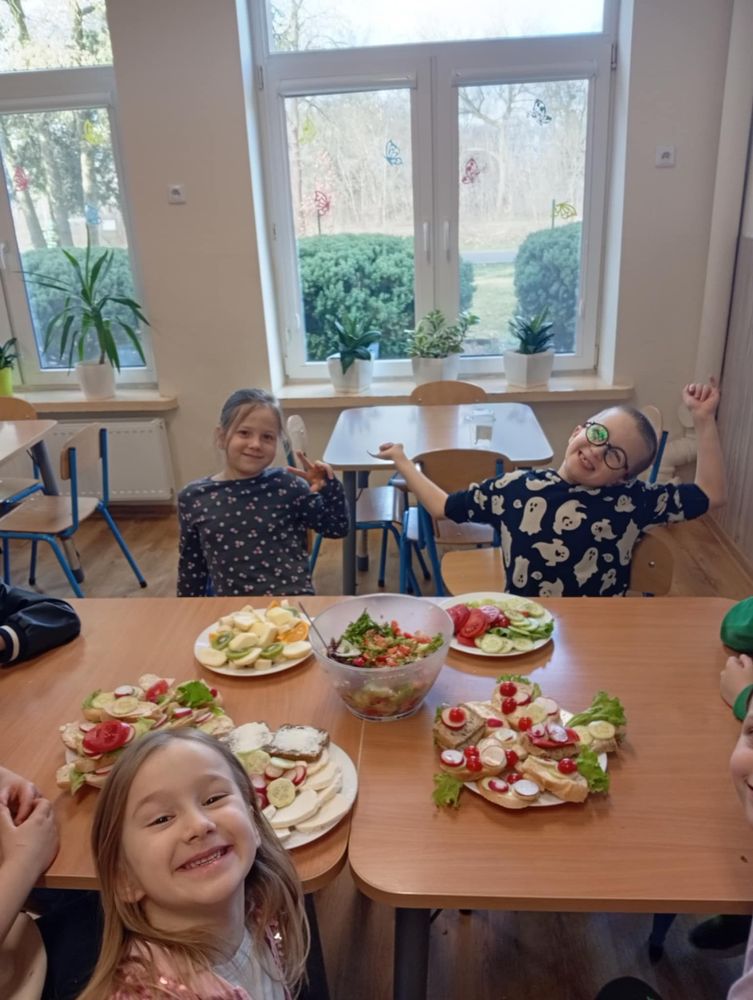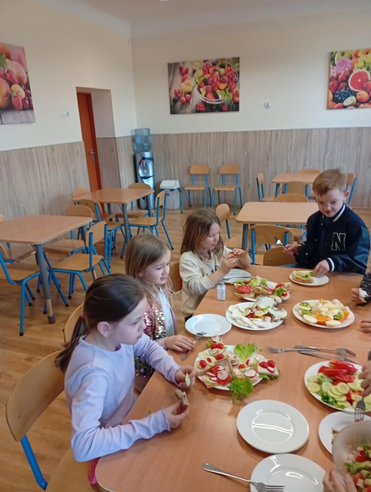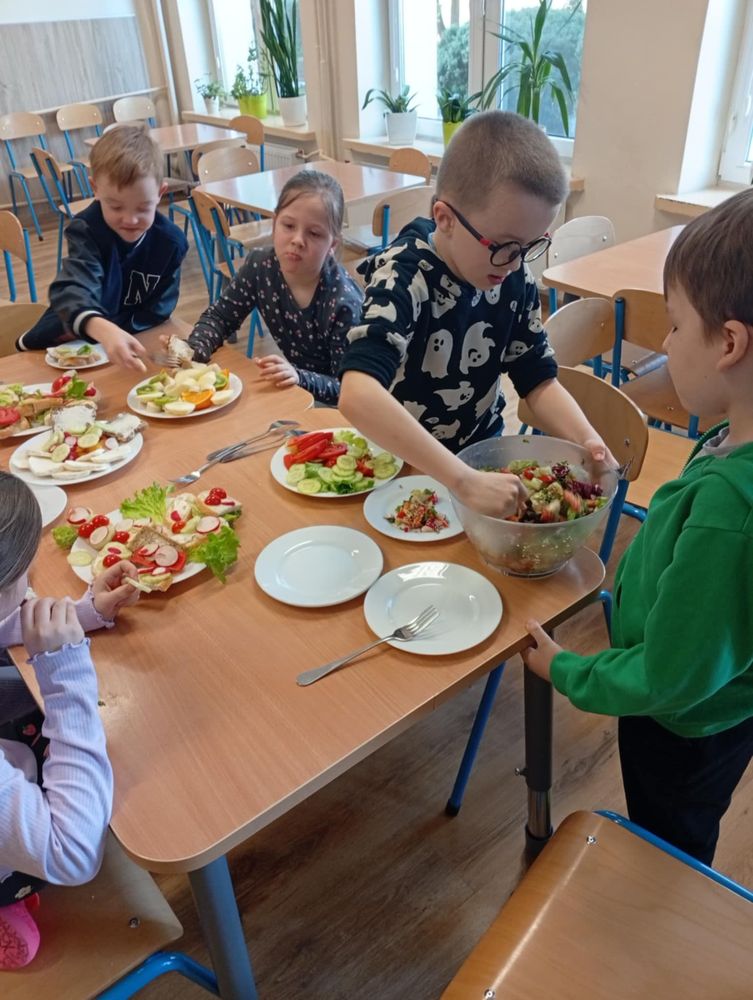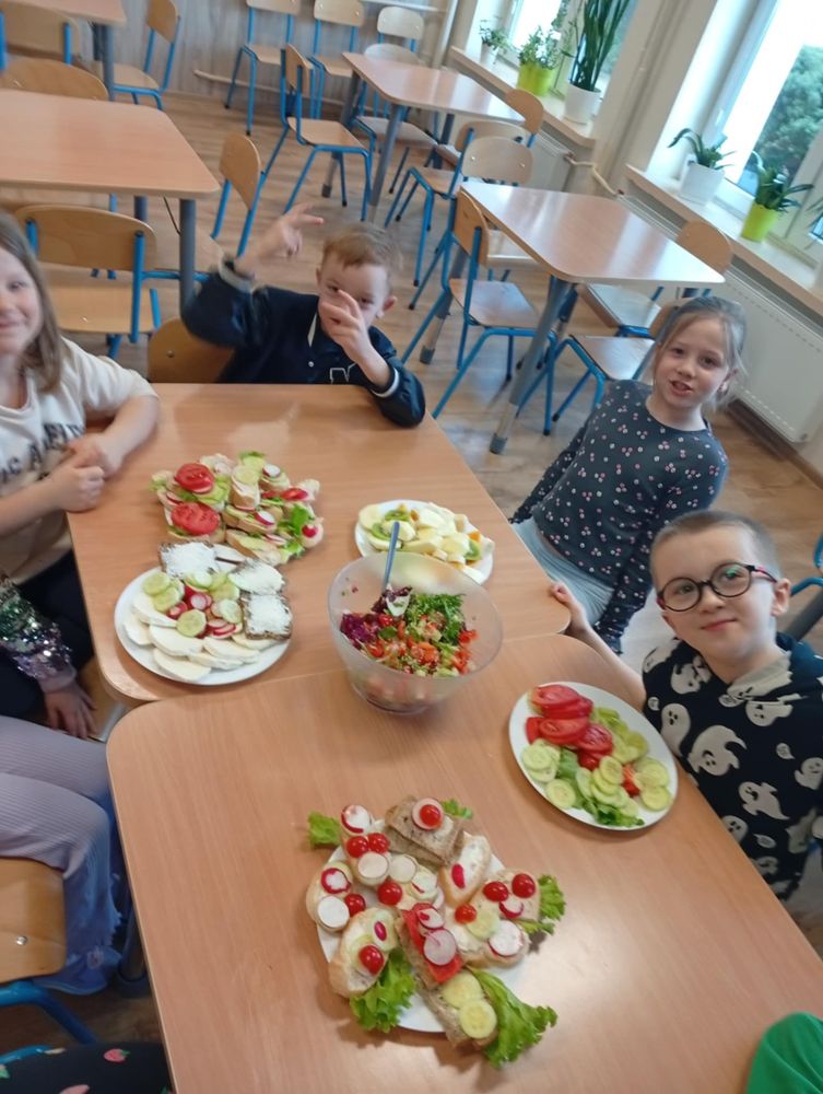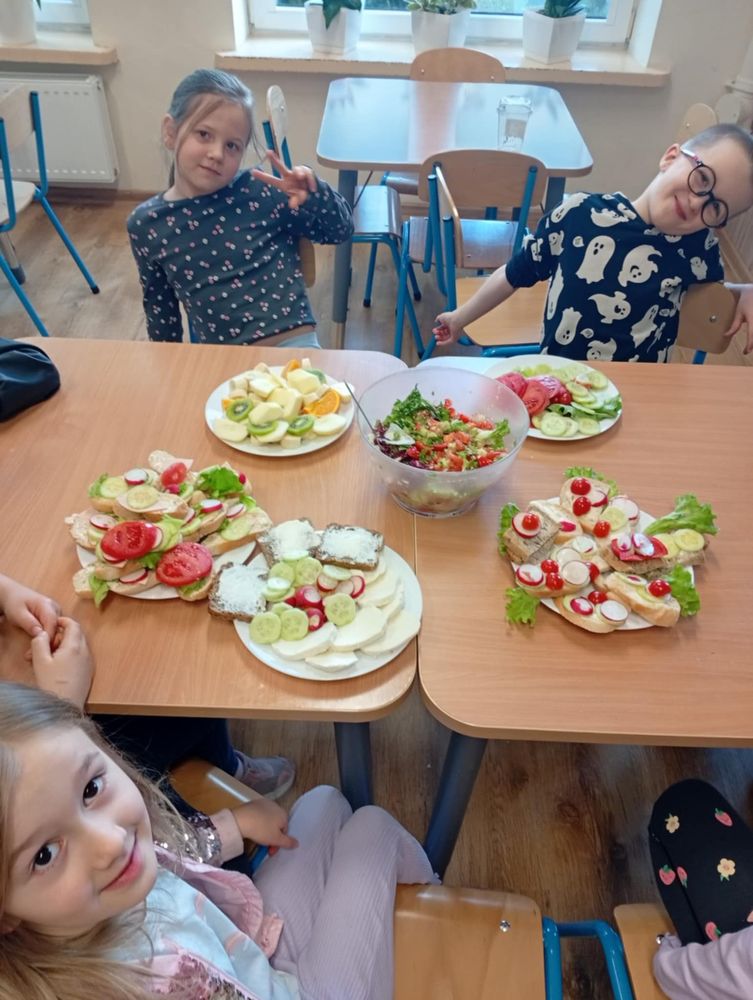 Uczniowie klasy I, w ramach propagowania zdrowego odżywiania, podczas zajęć przygotowali kolorowe i zdrowe śniadanie. Poza wspaniale przygotowanymi daniami było mnóstwo satysfakcji z samodzielnie wykonanej pracy, a także radości podczas wspólnego konsumowania. Oby zdrowe śniadania coraz częściej gościły w śniadaniówkach pierwszoklasistów.