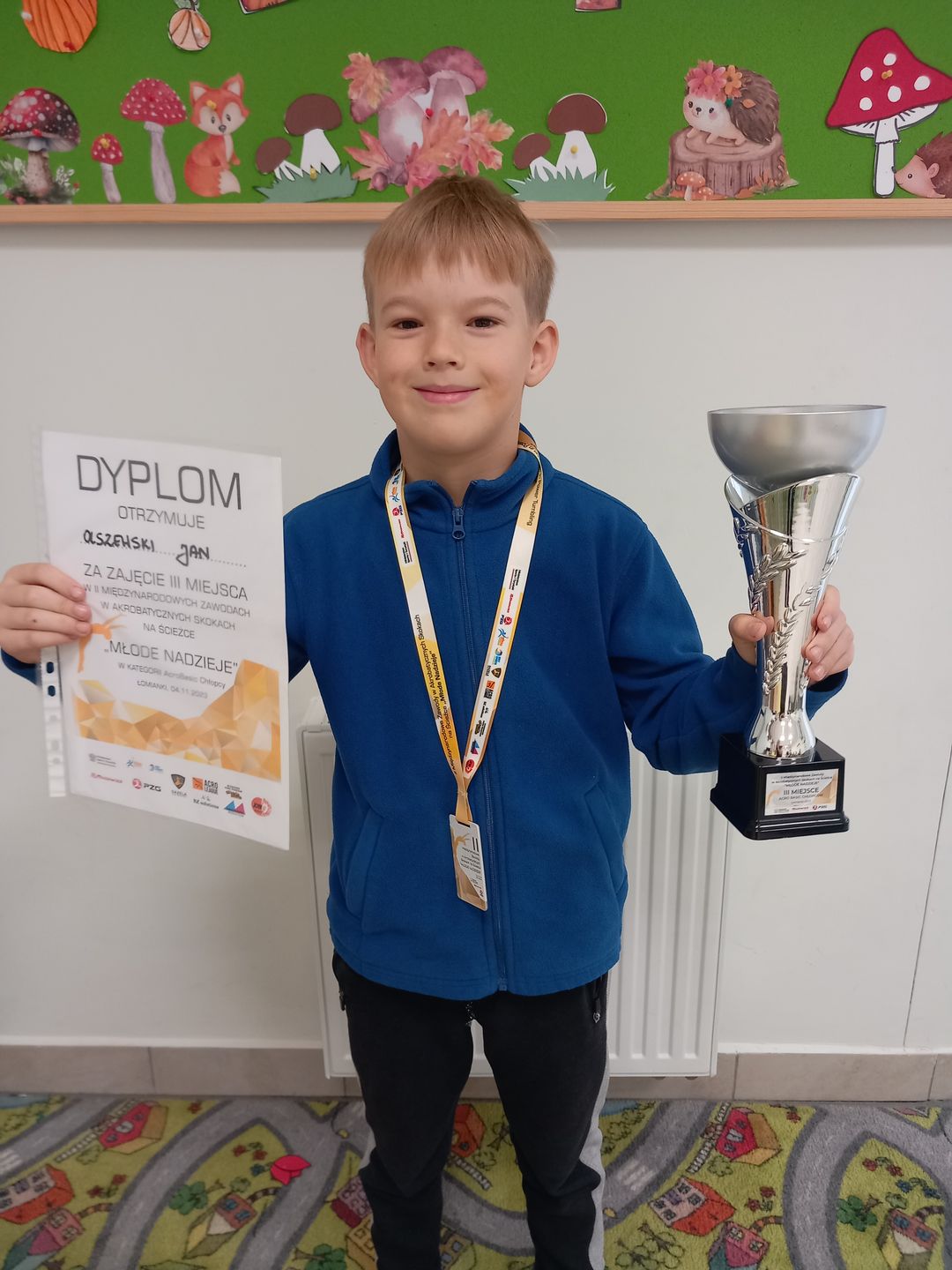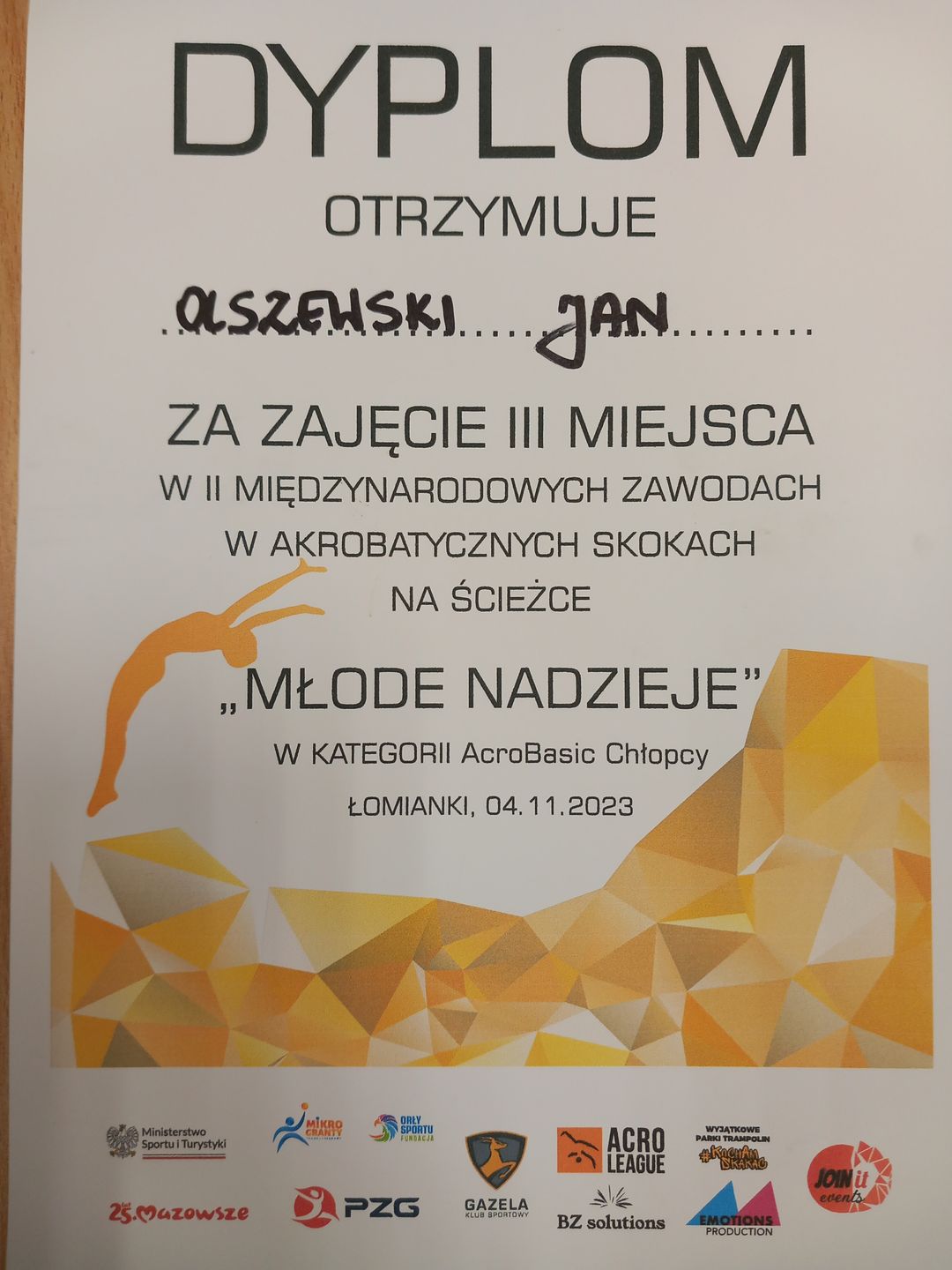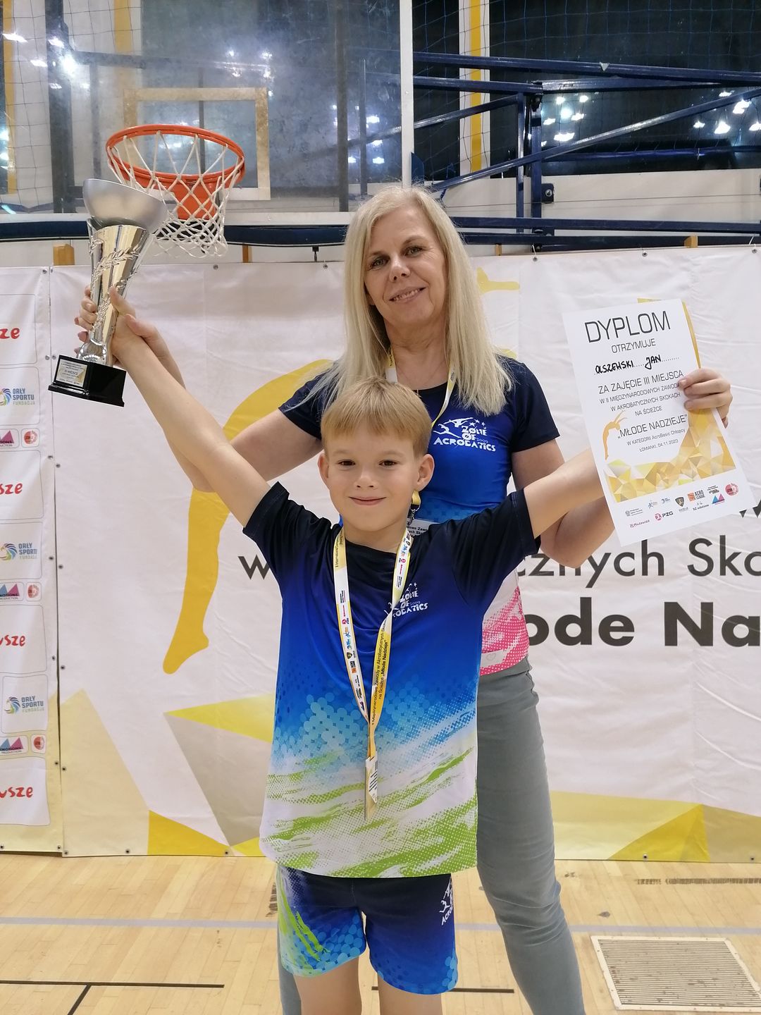 Dnia 4 listopada w Łomiankach odbyły się II Międzynarodowe Zawody w skokach na ścieżce MŁODE NADZIEJE - impreza, która przyciąga uwagę gości z całej Polski, ale również zza granicy. Podczas zmagań sportowych klub Zone Of Acrobatics reprezentował Jan Olszewski, który spokojnie zakwalifikował się do finału imprezy prezentując dwa dynamiczne układy na ścieżce. W wielkim finale liczącym ośmiu najlepszych Zawodników, Janek obronił swoje wysokie miejsce w czołówce i ostatecznie zdobył brązowy medal okraszony ogromnym wzruszeniem Trenerów, Rodziców oraz przyjaciół klubowych. To największe osiągnięcie Janka w jego sportowej karierze, więc gratulujemy z całego serca i prosimy o trzymanie kciuków za kolejne starty Naszego akrobaty!
