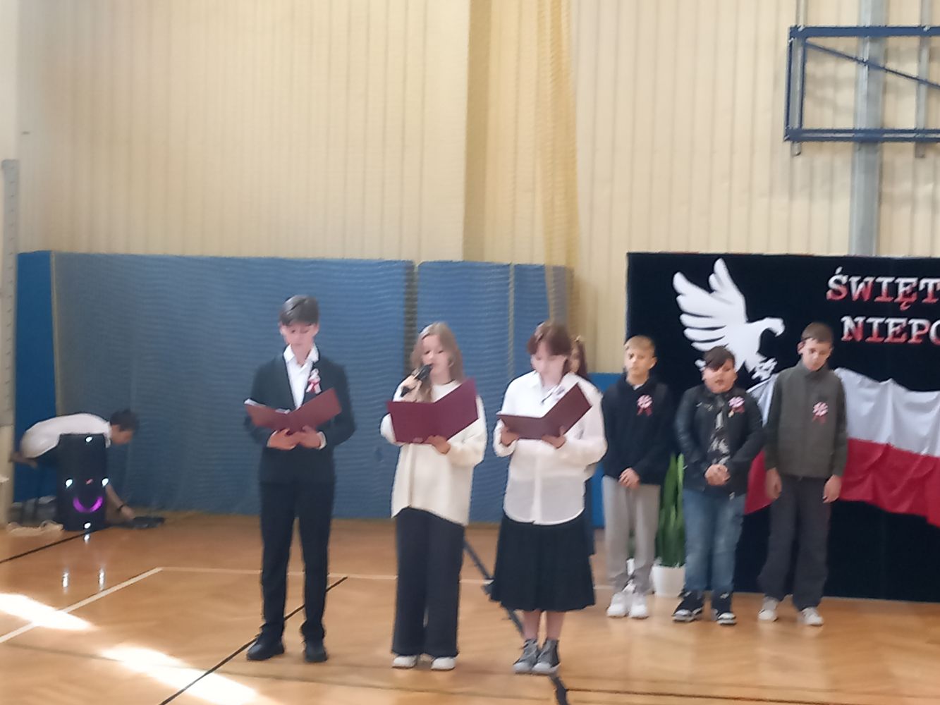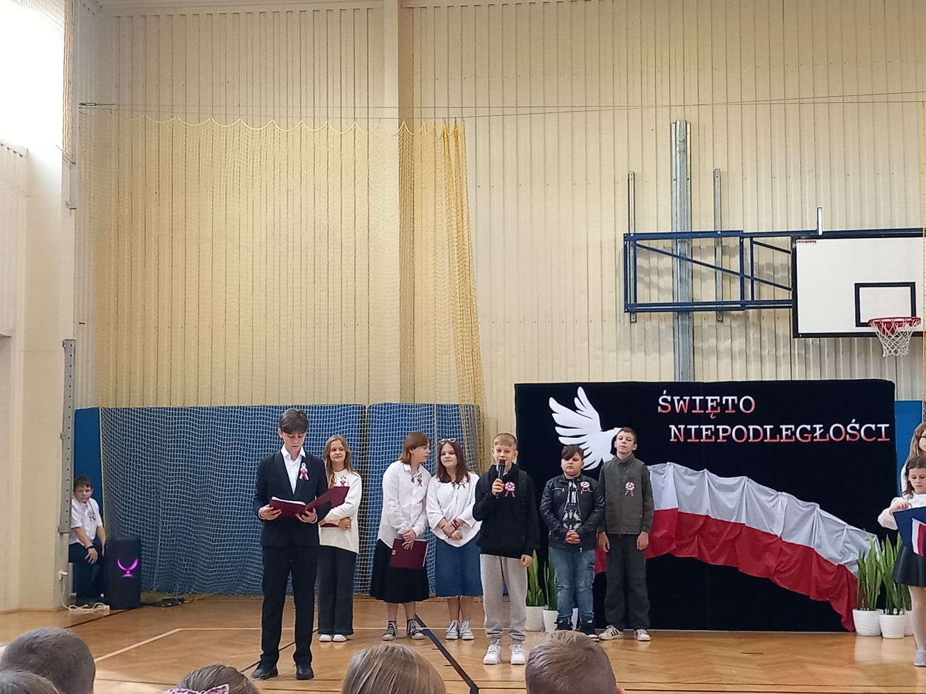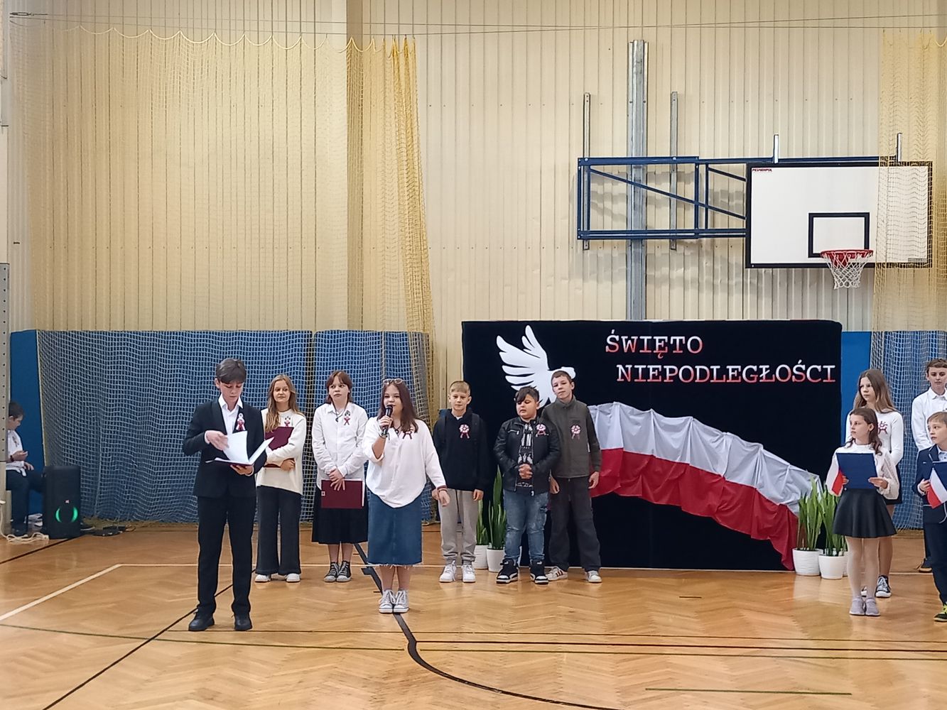 Dnia 10 listopada, w naszej szkole, odbył się apel z okazji Święta Niepodległości. Uczniowie klasy VI zapoznali wszystkich z najważniejszymi informacjami dotyczącymi odzyskania przez Polskę wolności oraz przypomnieli o pochodzeniu symboli narodowych. Zwrócili uwagę na fakt, że nasi rodacy, choć zbyt słabi na walkę zbrojną, walczyli inaczej – poprzez pielęgnowanie polskiej kultury i języka. W czasie akademii uczniowie klasy IV zaśpiewali piosenki wysławiające piękno naszego kraju, a młodzież z klasy VII odśpiewała „Rotę” Marii Konopnickiej. Społeczność szkolna upamiętniła wszystkich bohaterów walczących o naszą wolną Ojczyznę.