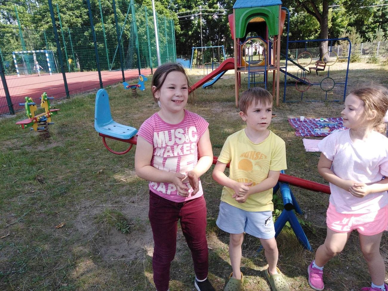 W ostatnim dniu nauki przed szkołą rozbrzmiewała muzyka i śmiech. Uczniowie klas 0, 1 i 2 żegnali się w bardzo wesołym nastroju. Nikt nie zapomniał o dobrym humorze. Rodzice przygotowali poczęstunek: owoce, słodycze, napoje. Były nawet lody! Wychowawczynie zadbały o różne atrakcje: tańce, zabawy ruchowe, gry planszowe, rysowanie kolorową kredą na chodniku. Dla każdego coś dobrego. Jutro rozdanie świadectw i zasłużone WAKACJE!