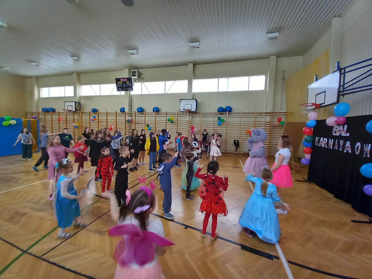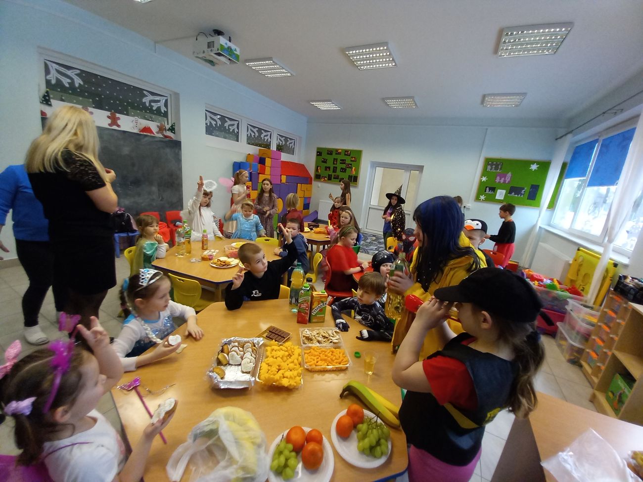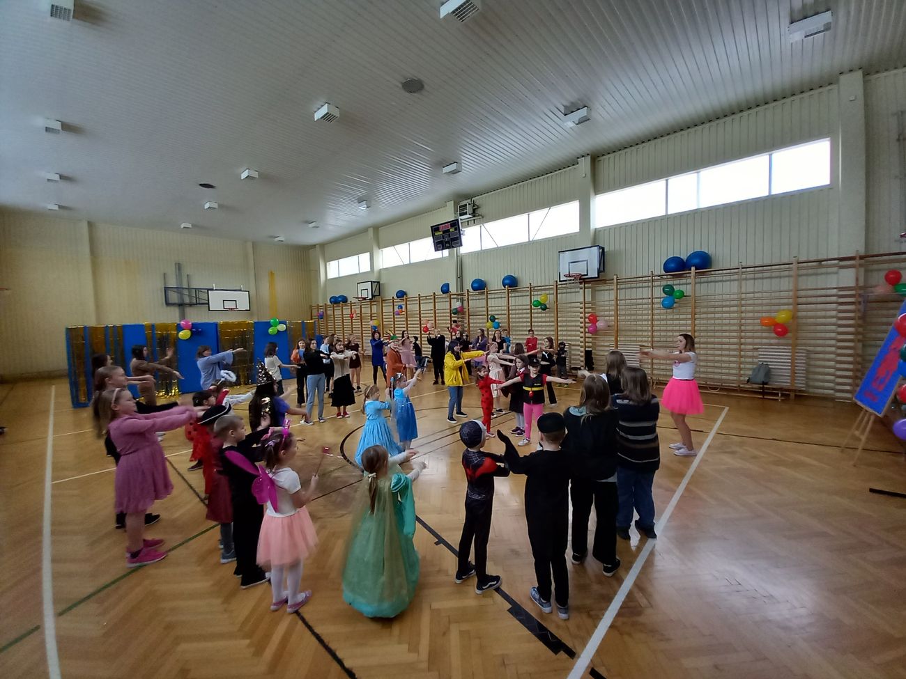 Tego dnia już od rana pojawiały się kolorowe postacie. Dzieci przebrane były za bohaterów znanych bajek. Można było spotkać wróżki, królewny, księżniczki, motylki, rycerzy, piratów, strażaków, policjantów, Spider-Mana... - nie sposób zliczyć i wymienić tych wszystkich postaci. Rozpoznać dzieci było bardzo trudno. Wystrój sali wprowadził w radosny nastrój oraz zachęcał wszystkich do wesołej zabawy.