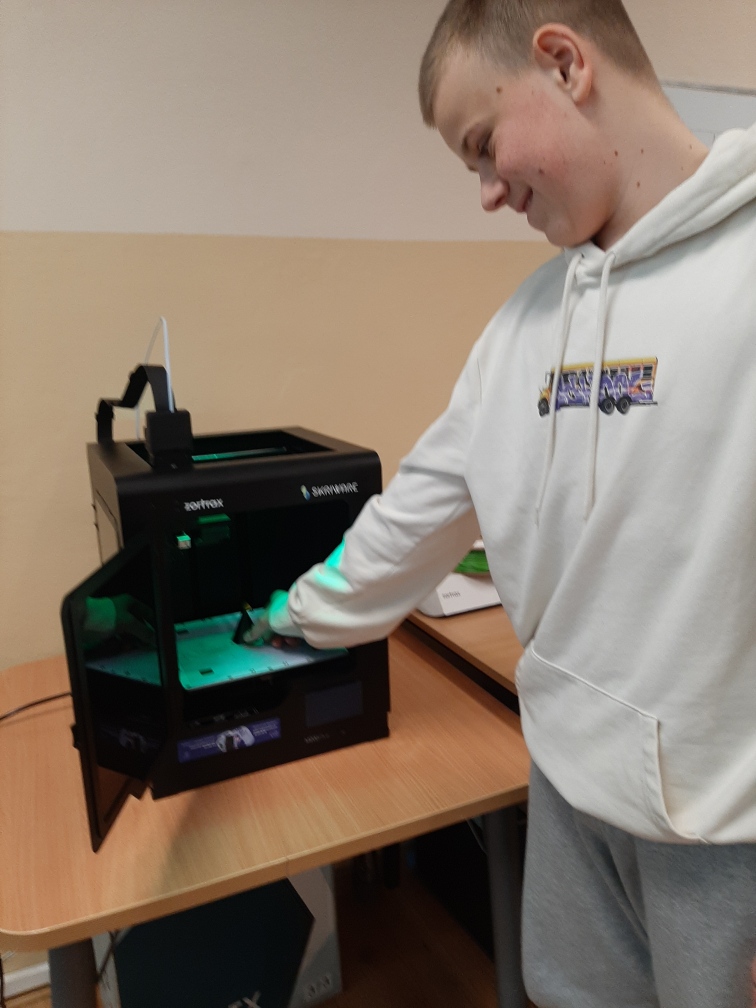 Na jednej z lekcji matematyki, uczniowie klasy ósmej, wykonywali model ostrosłupa sześciennego za pomocą drukarki 3D. Wykorzystywanie nowoczesnej technologii urozmaica typowe lekcje tworząc je ciekawszymi. Co pozwala na rozwijanie umiejętności i rozbudzanie wyobraźni młodego człowieka. Projektowanie i wykonywanie pomocy edukacyjnych wpływa na kreatywność naszych uczniów.