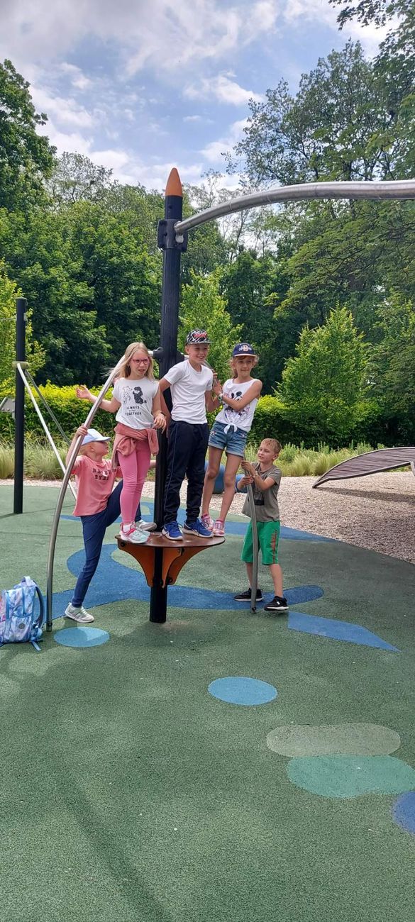 Aby znaleźć się w bajce nie trzeba wydawać fortuny na bilet do Disneylandu. Wystarczy obrać kierunek - Park Bajka w Błoniu. Tak też zrobiły 15 czerwca dzieci z klas 0 - 3. Z samego rana ruszyły w podróż pociągiem. Dla niektórych była to pierwsza wycieczka tym środkiem lokomocji. Park Bajka jest podzielony na kilka stref: cichego wypoczynku, strefa aktywności i imprez plenerowych. W pobliżu znajdują się budki z lodami, goframi, zapiekankami. Największym zainteresowaniem cieszyła się oczywiście strefa aktywnego wypoczynku z interaktywną fontanną, w której można bezpiecznie pobrodzić. Dzieci wspaniale bawiły się w wiosce indiańskiej i kąciku krzywych zwierciadeł. Niektórzy dokarmiali kaczki pływające w pobliskim jeziorku. Po szaleństwie można było odpocząć na leżakach XXL i zjeść ulubionego loda. Wyprawa dostarczyła maluchom niezapomnianych wrażeń i bezcennych wspomnień.