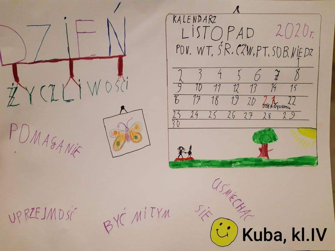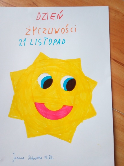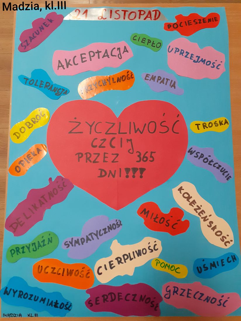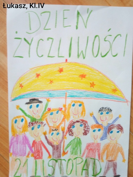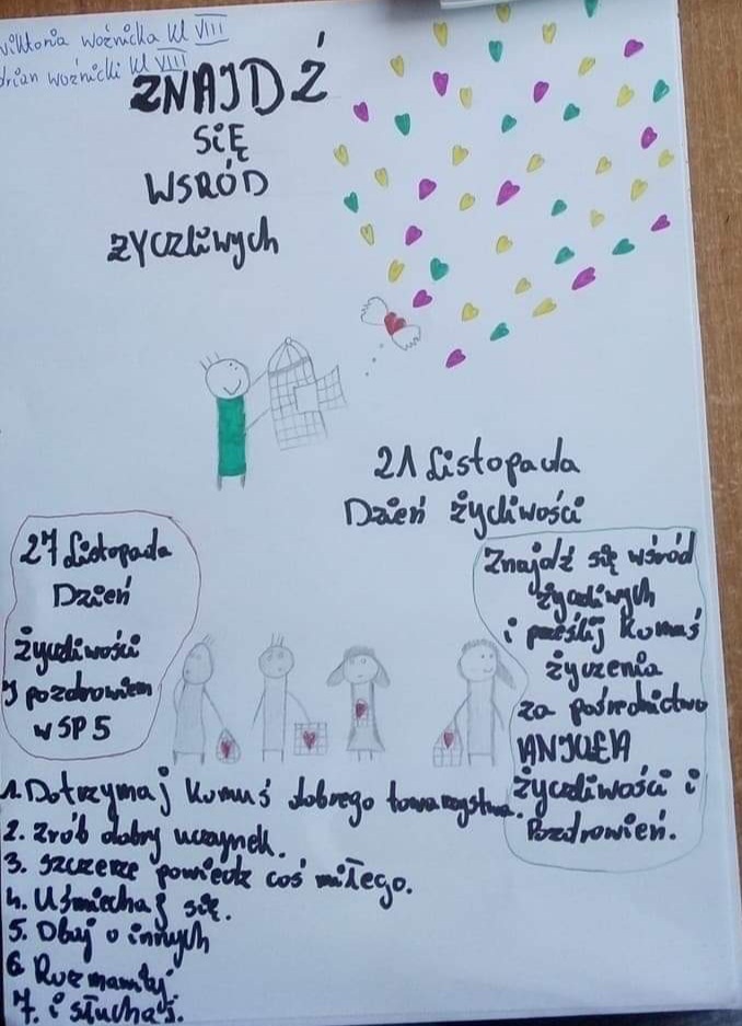 Z okazji Dnia Życzliwości, przypadającego 21 listopada, wychowawcy wszystkich klas poruszyli na lekcjach wychowawczych temat wzajemnego szacunku, współpracy, bezinteresownej pomocy innym oraz mówienia sobie miłych słów nie tylko od święta. Po zajęciach uczniowie wykonali plakat do zajęć. Zapraszamy do galerii zdjęć.