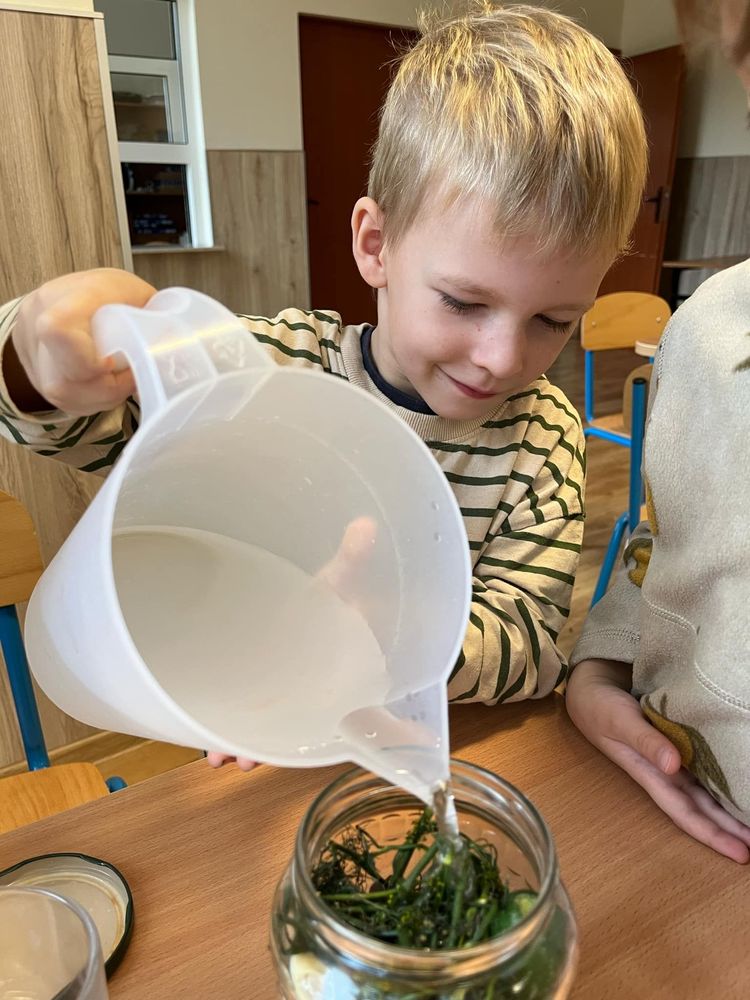 Wiemy już, że nie tylko one są potrzebne, ale również: chrzan, czosnek, koper, liście winogron lub porzeczki oraz woda i sól. Poznawaliśmy przyprawy zmysłami i dowiedzieliśmy się, że sól jest bezwonna. Teraz obserwujemy proces kiszenia. Wkrótce zjemy je ze smakiem 🙂