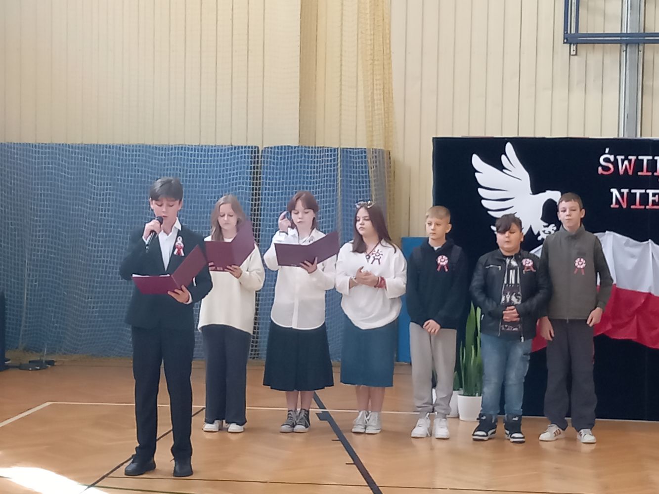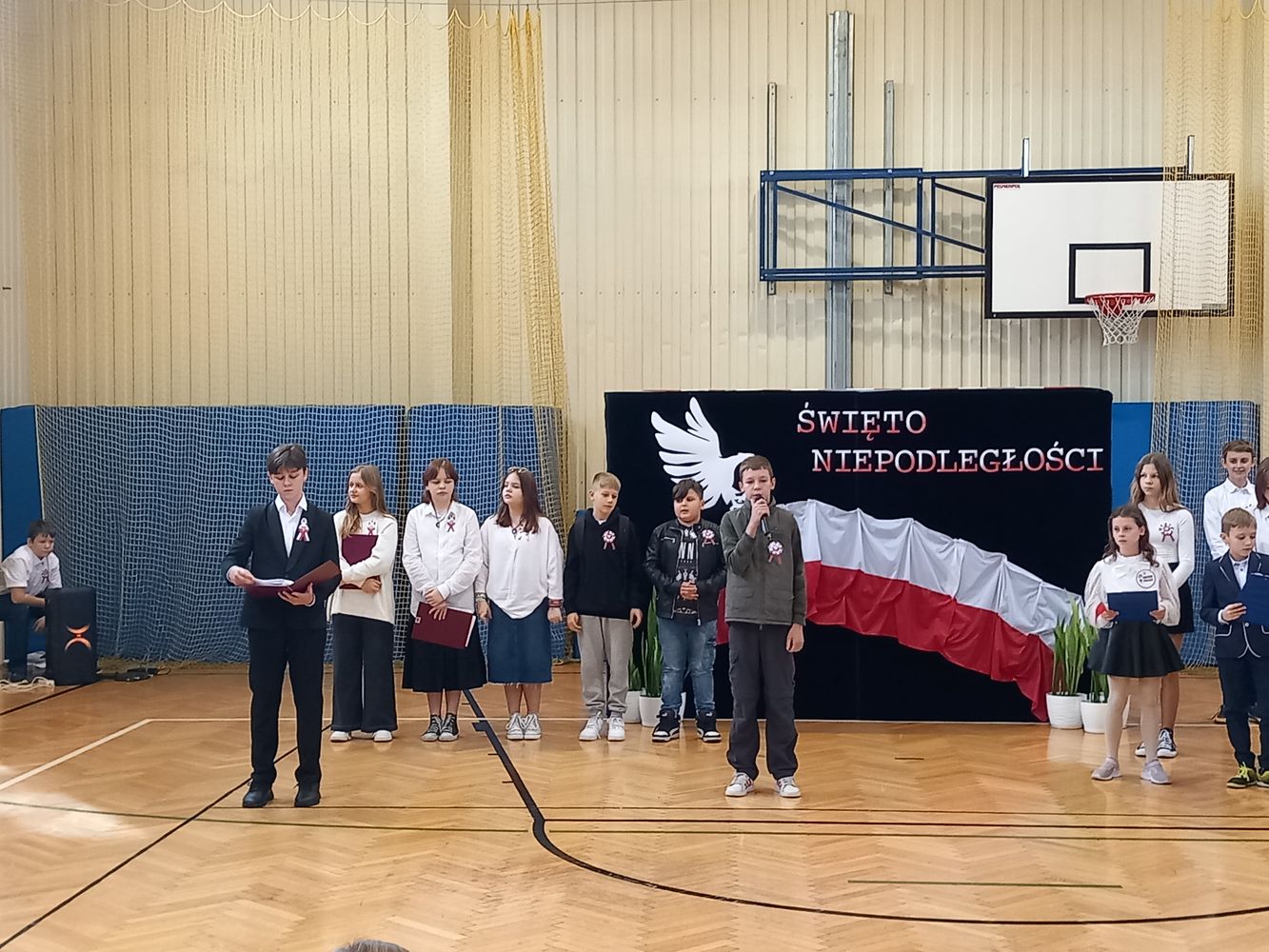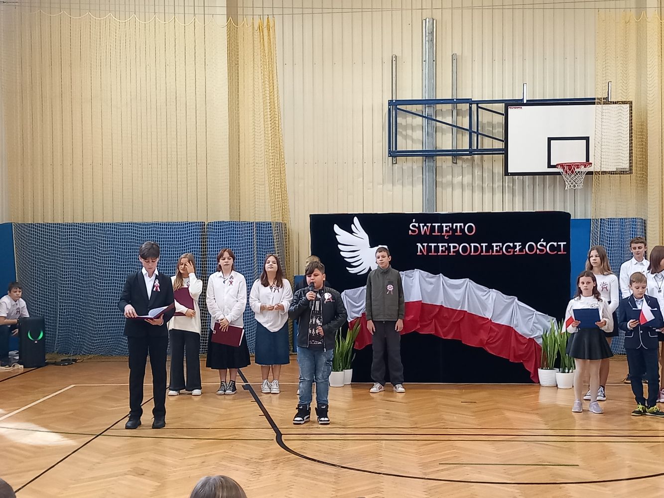 Dnia 10 listopada, w naszej szkole, odbył się apel z okazji Święta Niepodległości. Uczniowie klasy VI zapoznali wszystkich z najważniejszymi informacjami dotyczącymi odzyskania przez Polskę wolności oraz przypomnieli o pochodzeniu symboli narodowych. Zwrócili uwagę na fakt, że nasi rodacy, choć zbyt słabi na walkę zbrojną, walczyli inaczej – poprzez pielęgnowanie polskiej kultury i języka. W czasie akademii uczniowie klasy IV zaśpiewali piosenki wysławiające piękno naszego kraju, a młodzież z klasy VII odśpiewała „Rotę” Marii Konopnickiej. Społeczność szkolna upamiętniła wszystkich bohaterów walczących o naszą wolną Ojczyznę.