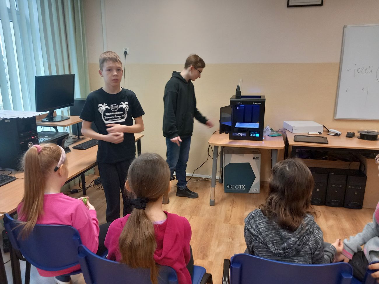 30 marca uczniowie klasy III uczestniczyli w lekcji pokazowej,podczas której starsi koledzy - Łukasz Kościk i Piotr Karaś, przedstawili im możliwości drukarki 3D. Uczniowie podczas zajęć zapoznali się z jej budową, sposobem działania oraz zasadami bezpiecznego korzystania. Możliwość druku przestrzennego bardzo zaciekawiła dzieci, rozbudzajac ich wyobraźnię. Urządzenie zostało zakupione w ramach rządowego programu #laboratoriaprzyszłości.
