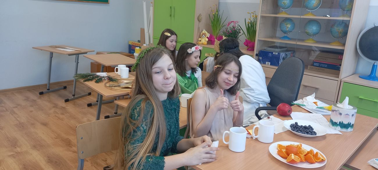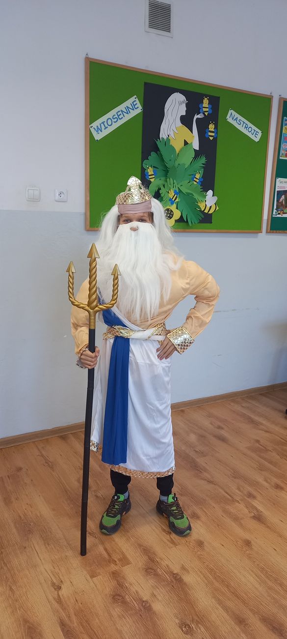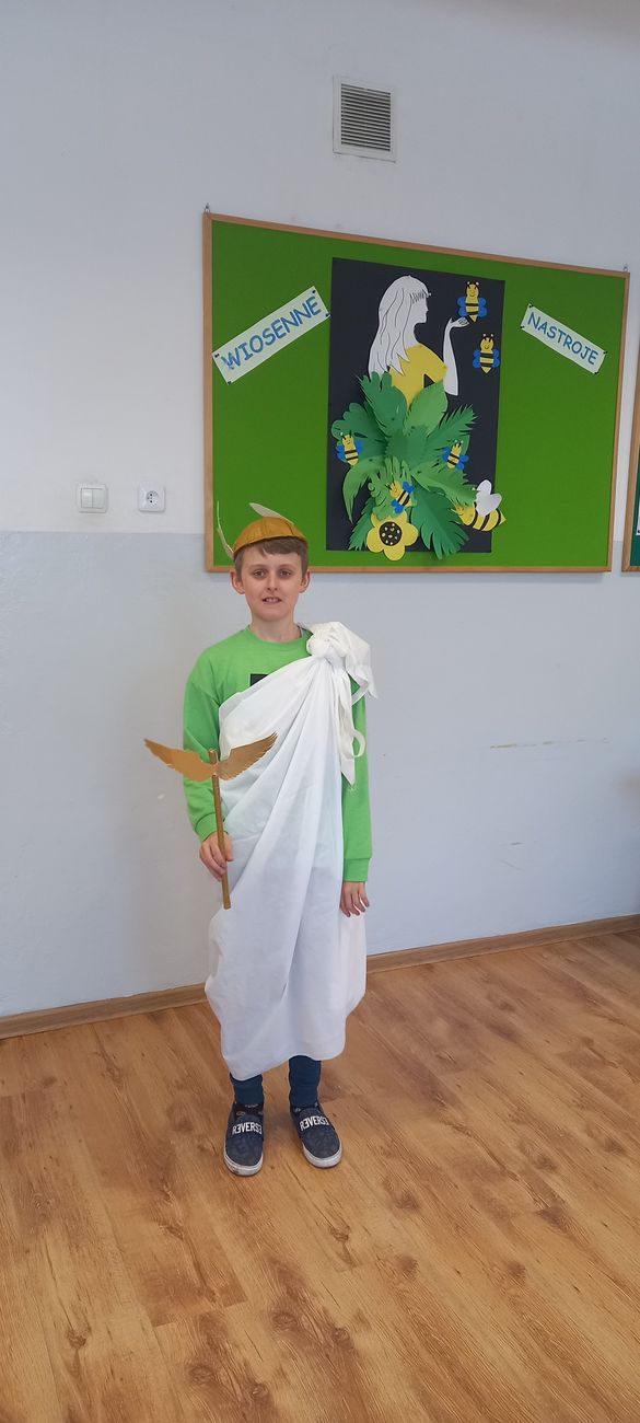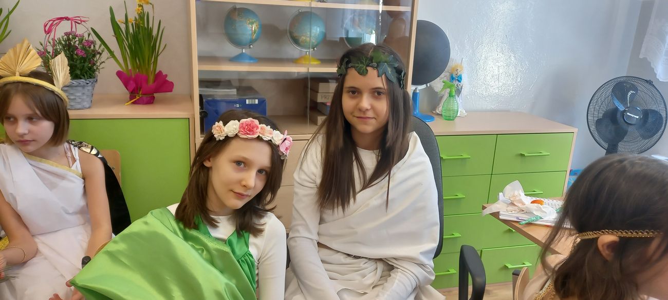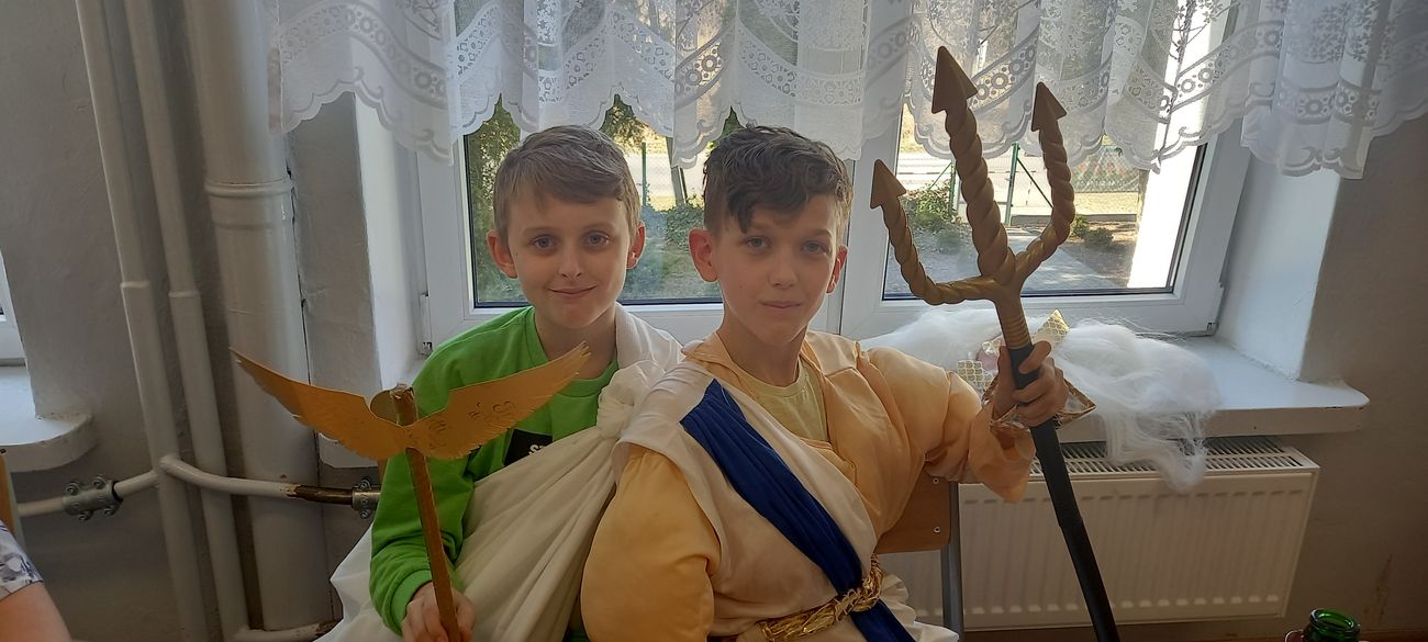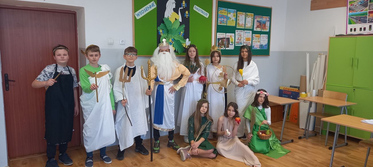 18 marca w klasie V odbyła się niecodzienna lekcja języka polskiego mająca na celu utrwalenie wiedzy uczniów na temat starożytnej Grecji. Zadaniem piątoklasistów było przygotowanie w formie ustnej najciekawszych wiadomości o greckich bogach, przebrań lub atrybutów poszczególnych bogów i przedstawienie ich podczas zajęć. Uczniowie świetnie się zaprezentowali, a nauka poprzez zabawę i teatr wpłynie pozytywnie na zapamiętanie poruszonego tematu.